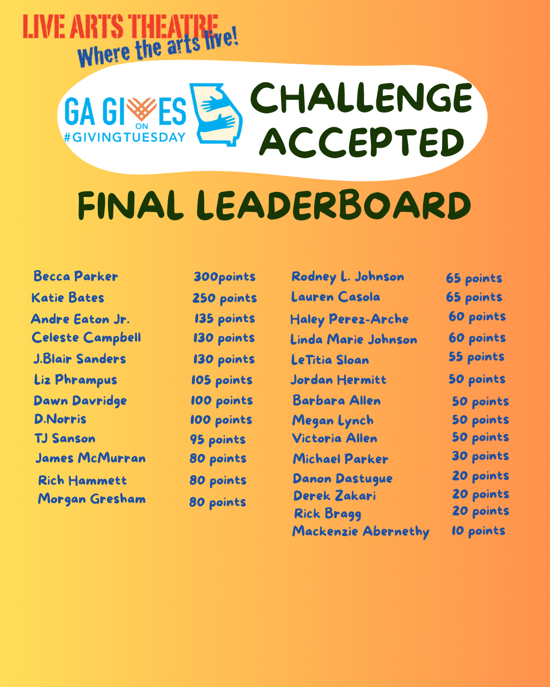 Challenge Accepted! We have our winners! This years top 10 (12 because of ties) are