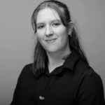 Black and white headshot for Blair Sanders. White female with long brown hair.Black and white headshot for Katie Bates. White female with long brown hair.